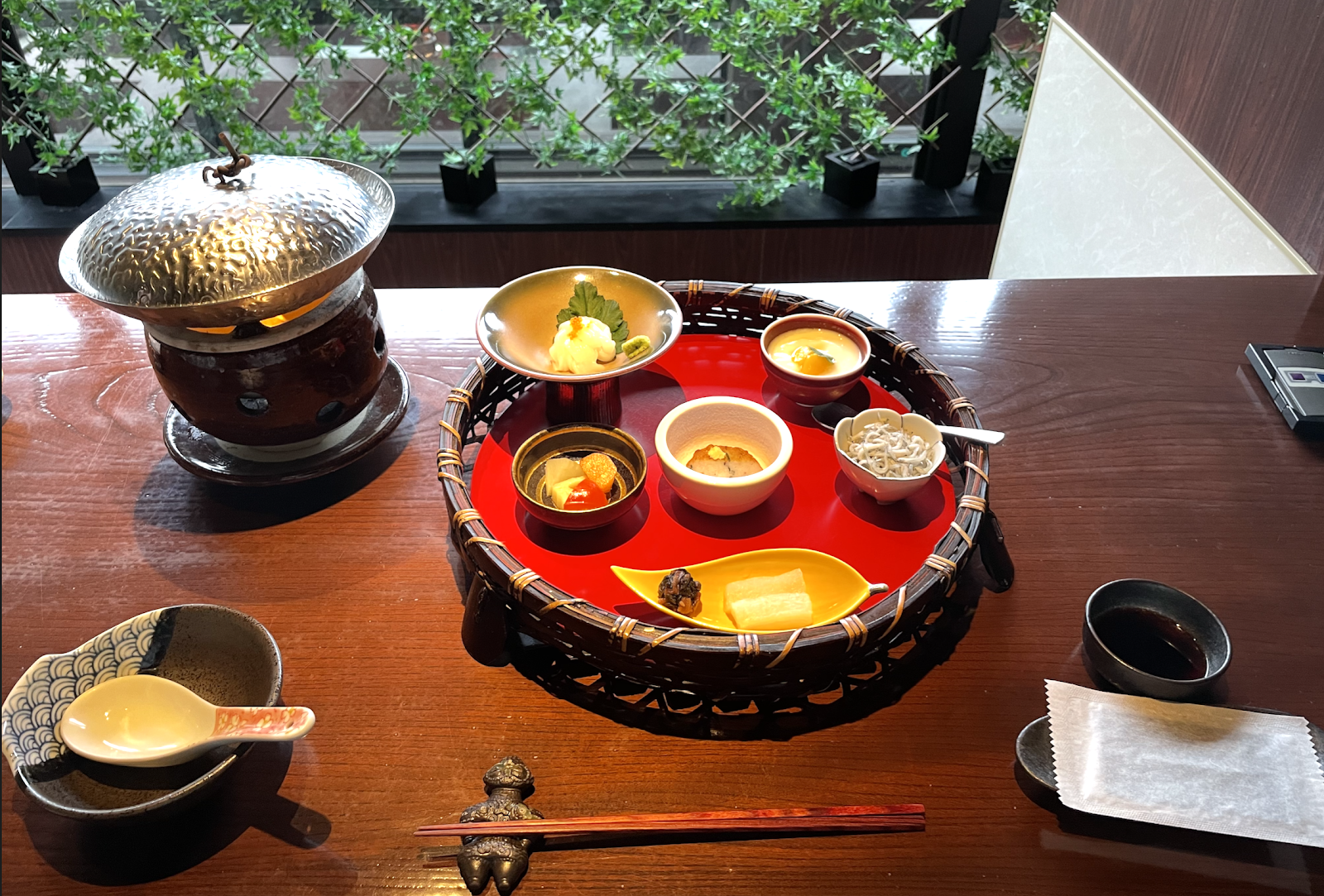 Dinner and breakfast were included in our rate at Hakone Airu. After we had relaxed a bit in the bath and room, a hotel employee knocked on our door to escort us to the dining area. He was right on time, based on our pre-planning at check in. Seating was private by group(!), which was a pleasant surprise. My husband and I sat side-by-side and had a nice view outside through the windows. Dinner was around 8 courses (including dessert), and there was a button on the table if we needed to call our waiter.
